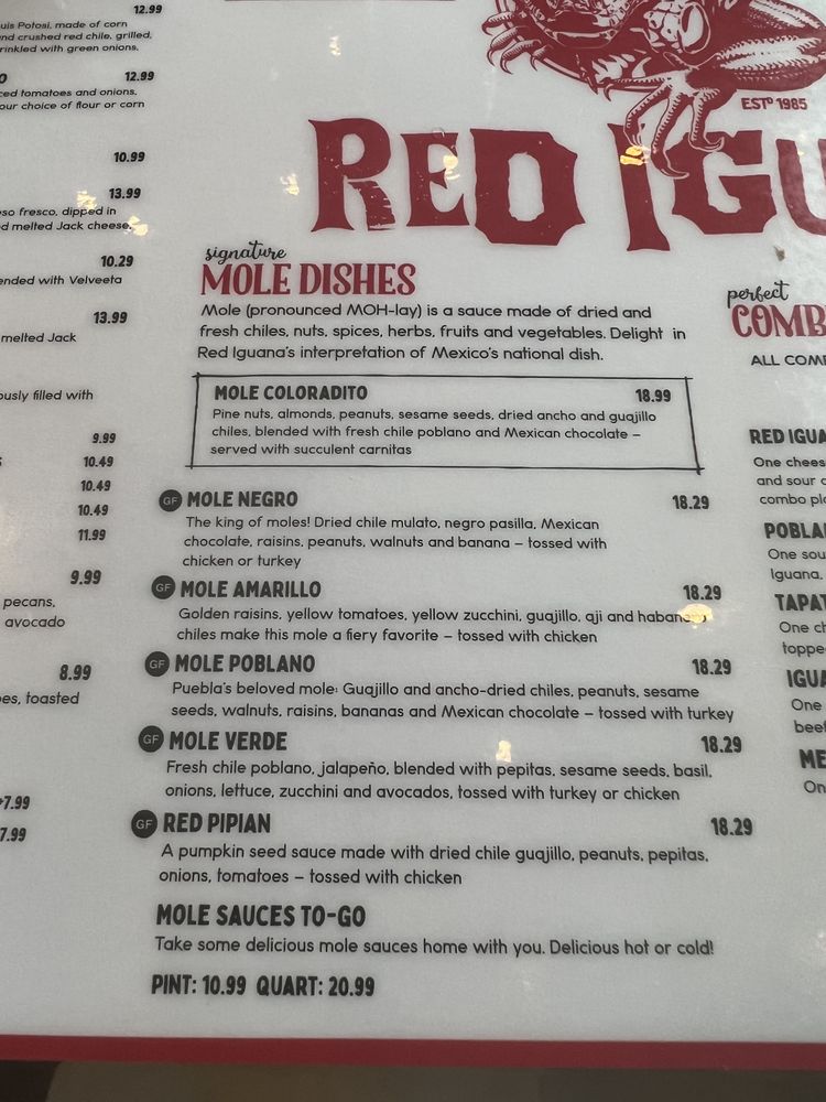 The king of moles! Dried chile mulato, negro pasilla, Mexican chocolate, raisins, peanuts, walnuts and banana tossed with chicken or turkey
